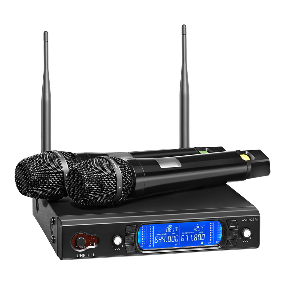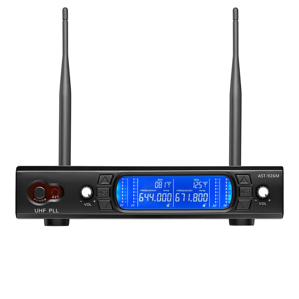 AST-926M - двухканальная беспроводная микрофонная система с двумя кардиоидными ручными передатчиками и одним двухканальным приёмником.