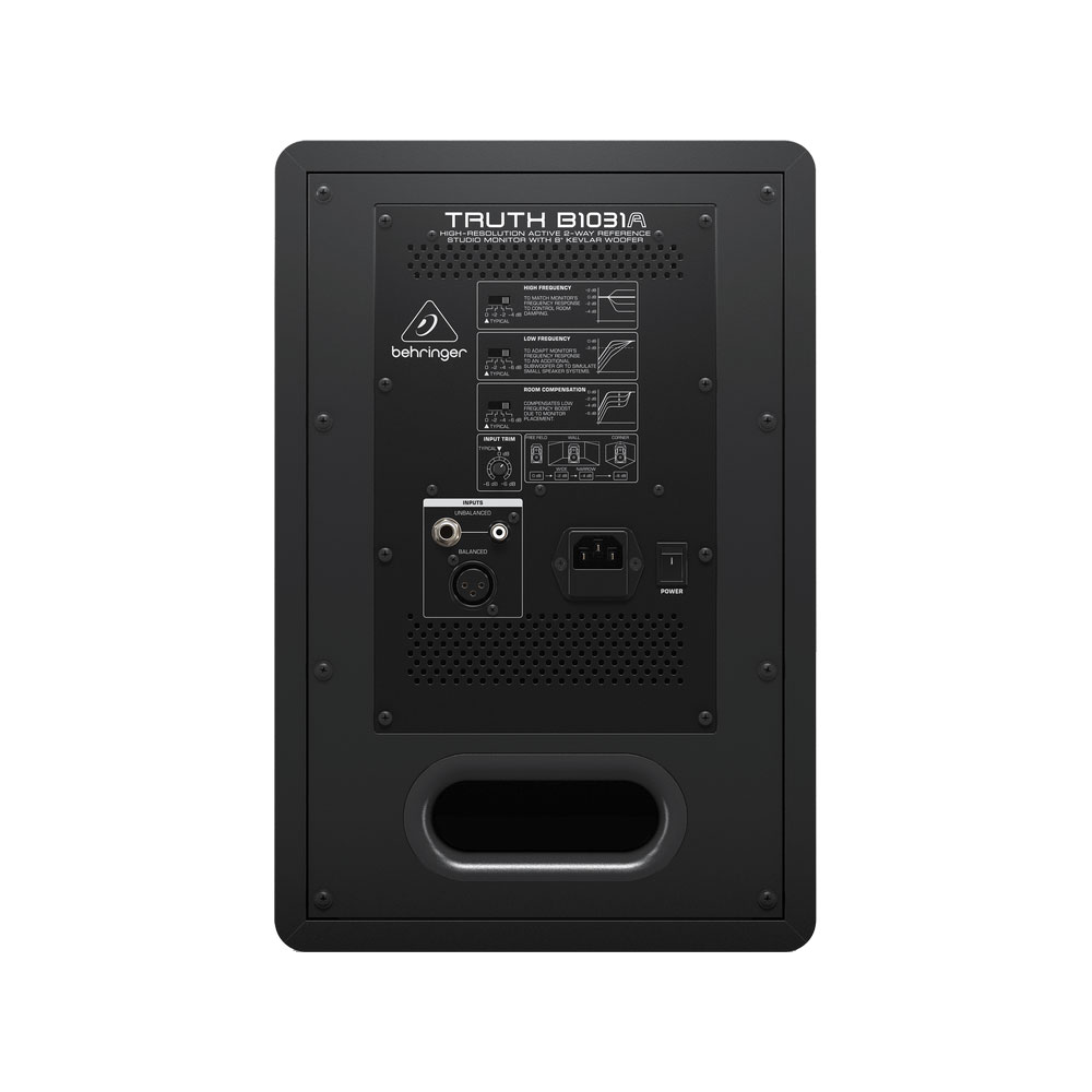 К числу основных особенностей мониторов относится схема двойного усиления (bi-amp). Это значит, что отдельно усиливается сигнал на низкие и средние, и отдельно на высокие частоты. Обеспечивается широкий частотный диапазон от 35 Гц до 20 кГц. В корпусе Behringer TRUTH B1031A находится два усилителя класса AB суммарной мощностью 103 Вт (70+33 Вт). Схема защищена от перегруза лимитерами, раздельными для нижнего и верхнего диапазона частот. На фронтальной панели есть дополнительный светодиод, показывающий превышение уровня (клиппинг). Реализована схема на базе высокоточного кроссовера с электронным фильтром Линквица-Райли четвертого порядка. Behringer TRUTH B1031A может предложить аналоговый балансный вход на разъеме XLR и пару небалансных: 1/4" TRS Jack и RCA. Все они расположены на тыловой панели.