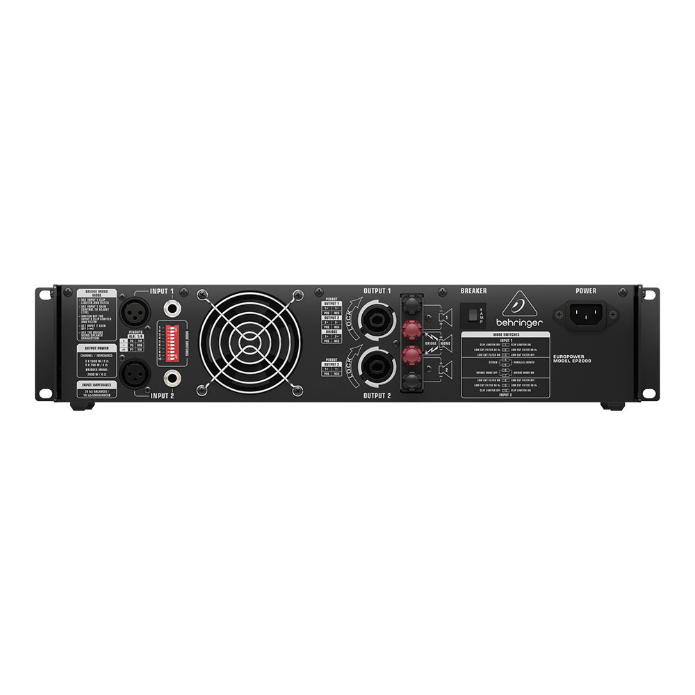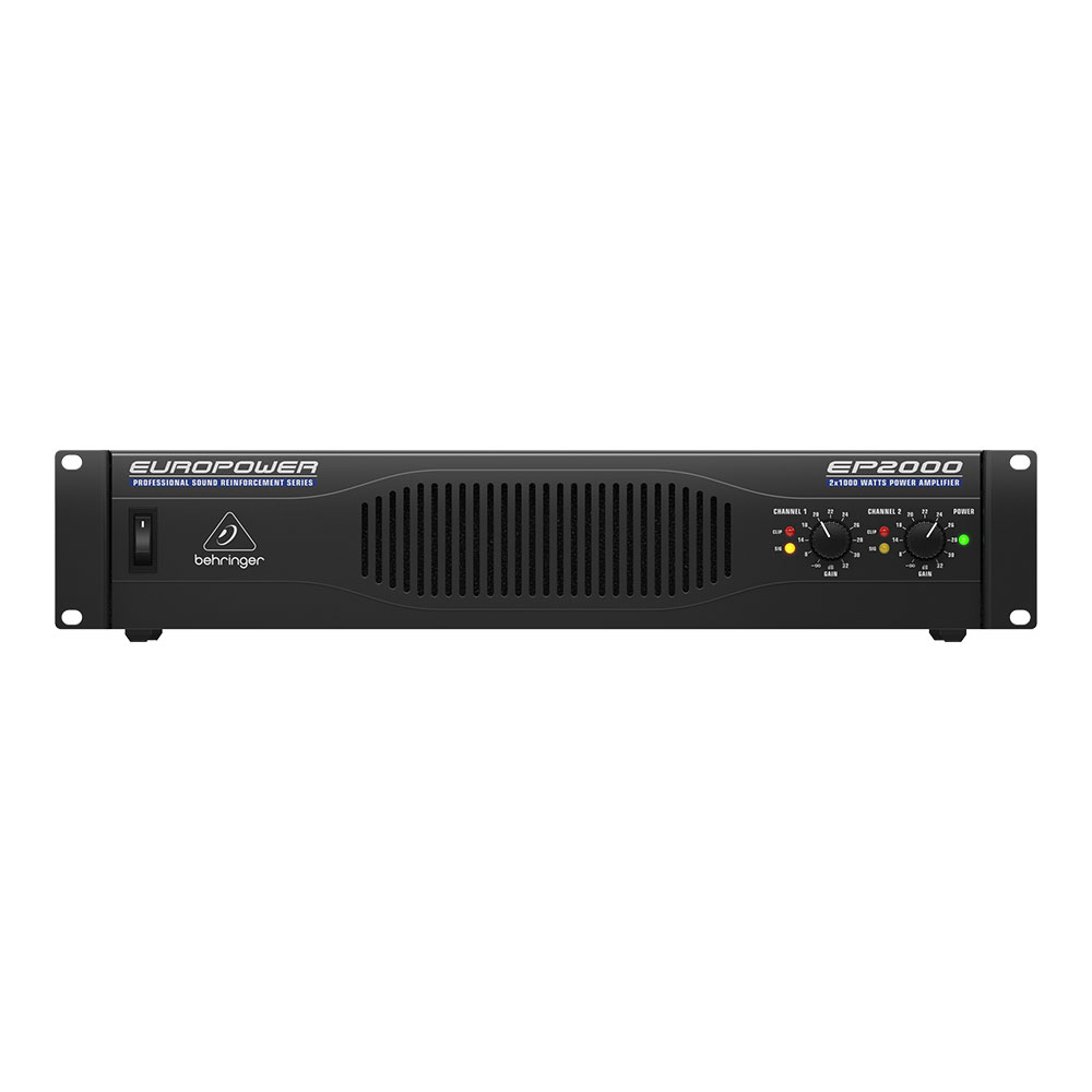 Behringer EUROPOWER EP2000 – профессиональный студийный двухканальный усилитель мощности класса AB, работающий в монофоническом, стереофоническом и мостовом режимах. Выходная мощность сигнала, обработанного с помощью усилителя, зависит от сопротивления и количества подключенных к нему динамиков. В случае стереофонического подключения двух колонок с сопротивлением 2 Ом каждая, обеспечивается мощность сигнала в каждом канале, равная 650 Вт. При нагрузке с сопротивлением 4 Ом мощность сигнала на канал составляет 500 Вт, восьмиомная нагрузка соответствует 350 Ваттам на канал. В режиме моста, когда сигнал подаётся на один динамик с сопротивлением 4 Ом, мощность равна 1300 Вт. С восьмиомной нагрузкой в мостовом режиме усилитель выдает 1000 Вт. Специальная технология Accelerated Transient Response улучшает воспроизведение низких частот, транслируемых через требовательные к интенсивности сигнала НЧ-динамики, выравнивая их, и в результате усилитель легко может добиться качественного отчётливого звучания сабвуферов. Уровень искажений при обработке сигнала устройством не превышает 0,01%. Каждый из двух каналов усилителя имеет собственный лимитер, обеспечивающий максимальный уровень выходного сигнала при надёжной защите динамика, регулятор усиления, а также индикаторы сигнала и клиппирования. Для повышения качества звука может использоваться отключаемый низкочастотный фильтр, отсекающий технические шумы, создаваемые электронным оборудованием.
