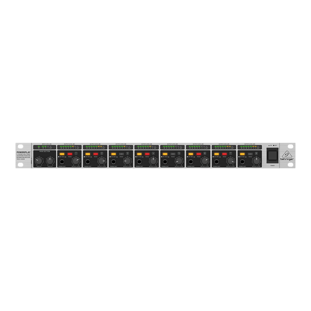 Behringer HA8000 V2 – это профессиональный рэковый предусилитель для наушников. Имеет 8 независимых каналов с двумя парами выходов на разъемах 1/4'' TRS и входами 1/4'' TRS Direct In на задней панели. Это дает возможность включения двух независимых миксов параллельно. Их громкость регулируется ручками Main 1 и Main 2, а выбор одного из двух миксов осуществляется переключателем In 1/In 2. Первый выход для наушников находится на передней панели, второй на задней. 8-ступенчатая индикация на каждом канале и 5-ступенчатая индикация общей выходной громкости помогут избежать перегрузки. Устройство совместимо практически с любыми наушниками, а на самой высокой громкости звук не искажается и воспроизводится максимально чисто.