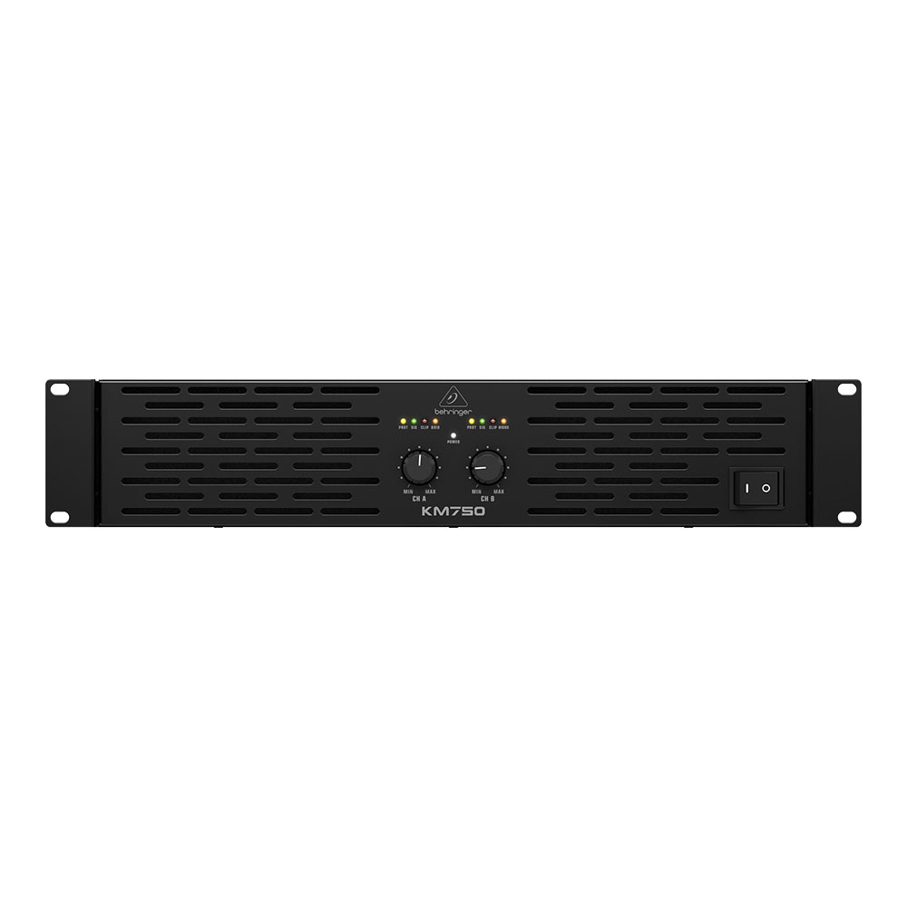 Behringer KM750 – профессиональный двухканальный усилитель мощности, которая варьируется в зависимости от нагрузки: к примеру, 400 Вт на канал обеспечивается при подключении четырехомной акустики. Выполнен в рэковом ударопрочном корпусе высотой 2U. Подключения источников происходят с помощью разъемов трёх типов: XLR, 6.35 мм TRS Jack (балансные и небалансные подключения), плюс стереопара RCA для бытовых источников. Выходы выполнены на Neutrik Speakon.