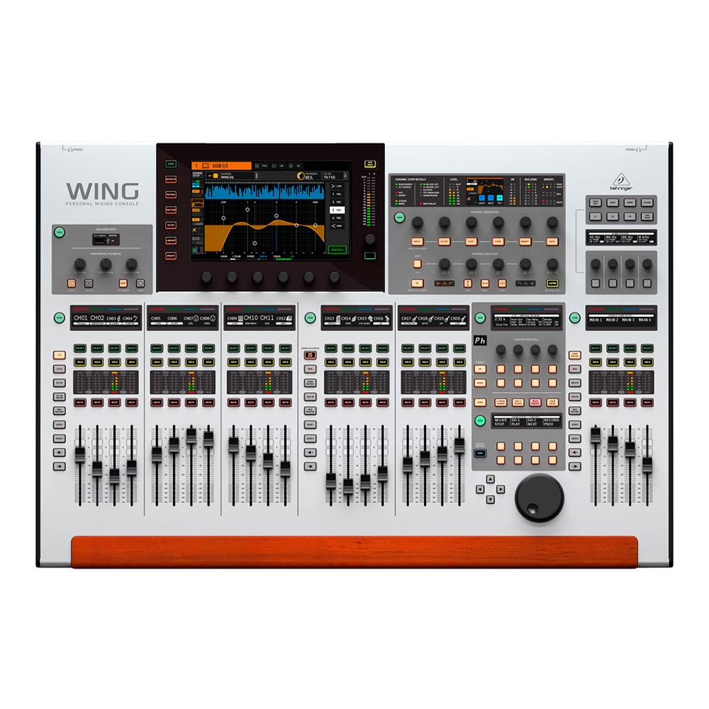 Behringer Wing — 48-канальная цифровая микшерная консоль с 8 предусилителями Midas Pro, 24 100 мм моторизированными фейдерами, сенсорным дисплеем, 28 шинами и функцией аудиоинтерфейса. Консоль оснащена 8 микрофонными предусилителями Midas Pro и предназначена как для студийного, так и для концертного применения. Управляется Wing с помощью 10-дюймового сенсорного дисплея, 24 моторизированных фейдера на 100 мм, а также множества других элементов управления, многие из которых можно переназначит под свои нужды.