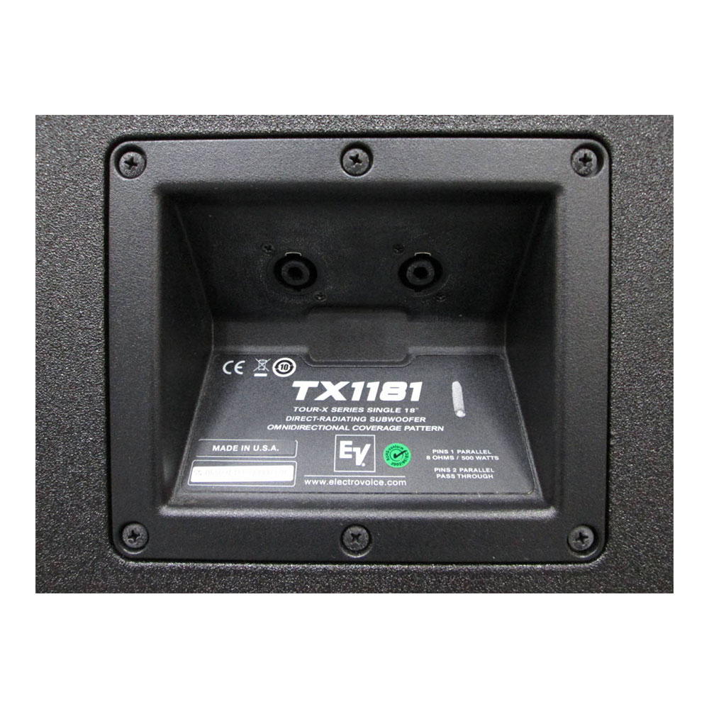 Пассивный сабвуфер TX1181 производства компании Electro-Voice является довольно мощным устройством в основе которого лежим массивный низкочастотный 18” динамик с длинным ходом. Встроенный фильтр низких частот с фиксированной частотой среза 30 Гц, позволяет проводить фильтрацию выходного сигнала и использовать TX1181 для параллельного подключения высокочастотных акустических систем, например, ТХ1122 или ТХ1152.