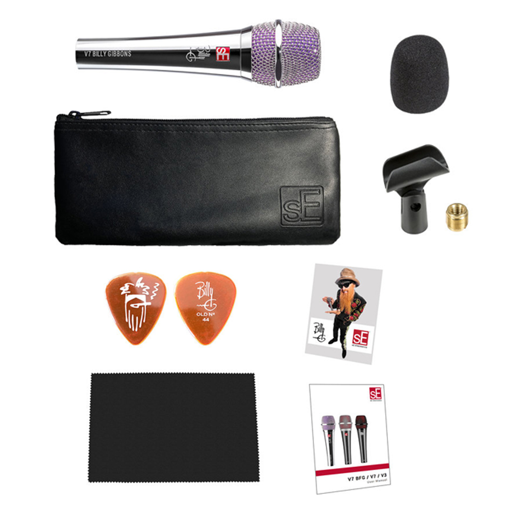 Богатая комплектация sE Electronics V7 BFG включает в себя зажим для микрофонной стойки с адаптером, чехол из искусственной кожи, тряпочку из микрофибры для полировки микрофона, вышеупомянутую чёрного цвета ветрозащиту, инструкцию пользователя, стикер и два подписанных медиатора.