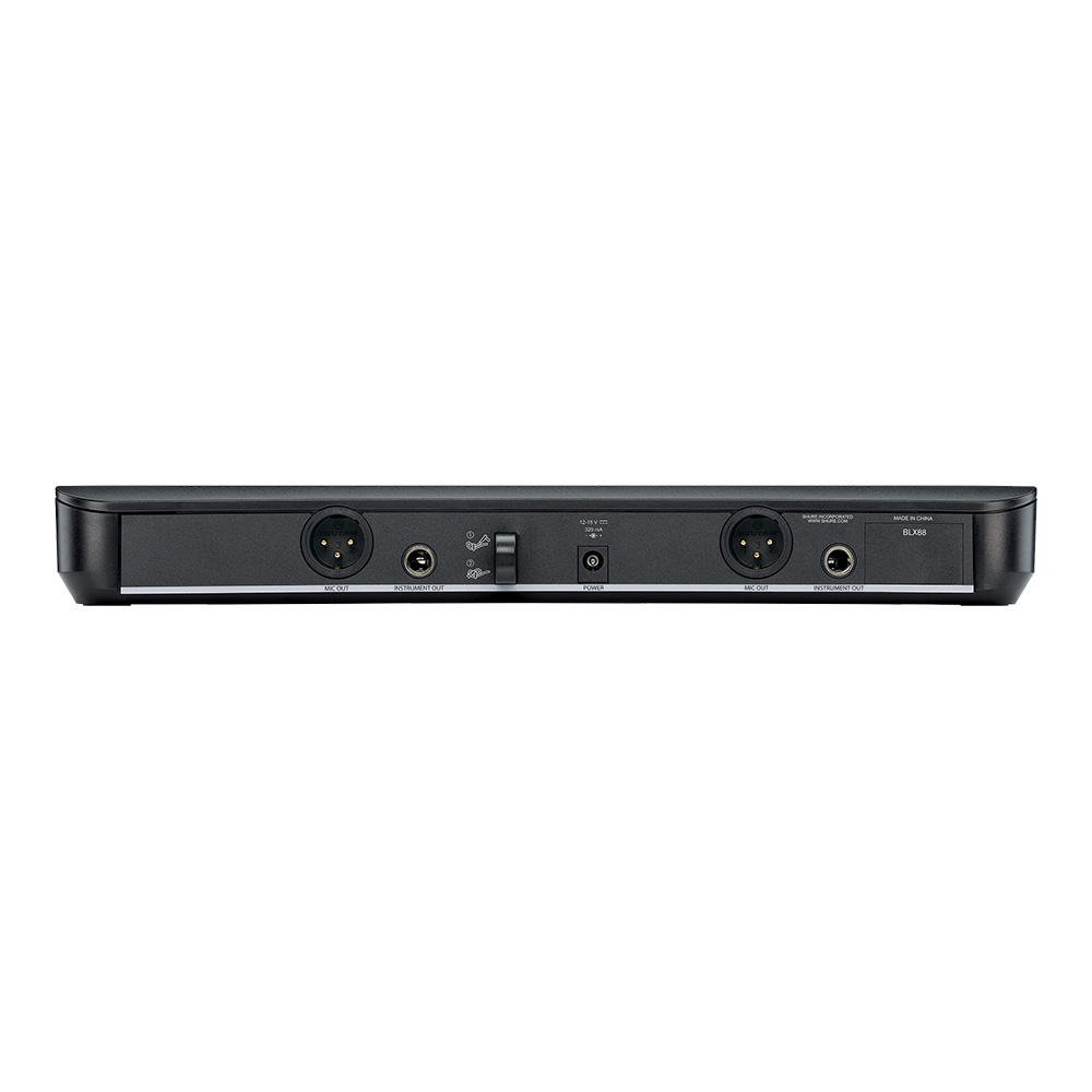 Универсальность BLX288 заключается в том, что если вам необходимо иметь несколько вариантов подключения (головная гарнитура и ручной микрофон), то вам не придется покупать отдельную радиосистему с нужным вам передатчиком, достаточно лишь докупить нужный передатчик, например поясной или головную гарнитуру (Headset) и подключить его к существующему приемнику. Такая возможность делает систему универсальной в использовании и значительно экономит ваши денежные средства при необходимости перестроения. Приемник BLX 88 имеет два приемника, которые работают на двух независимых каналах, что позволяет использовать одновременно два передатчика (для каждого отдельный аудио выход XLR/ ¼ Jack).