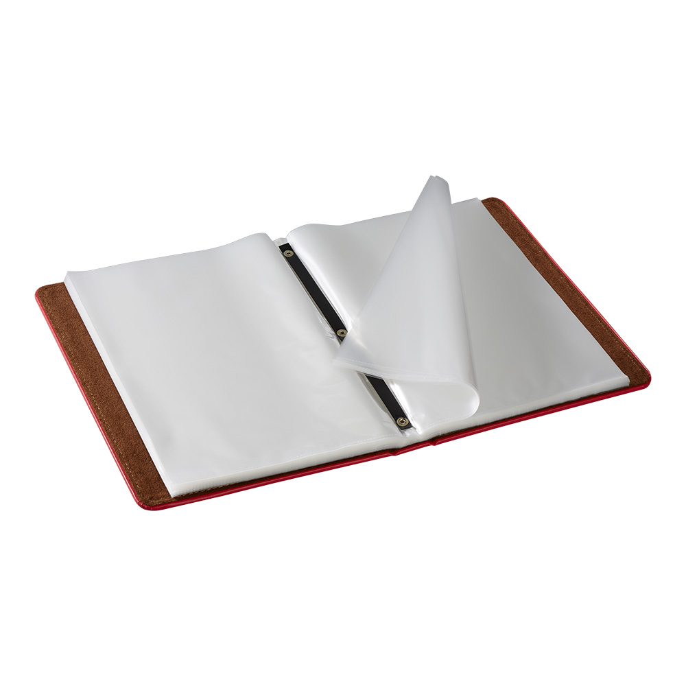 160 прозрачных файлов из пластика в прочном переплёте из искусственной кожи чёрного цвета. Внутренняя сторона обложки отделана кожей или бархатом.