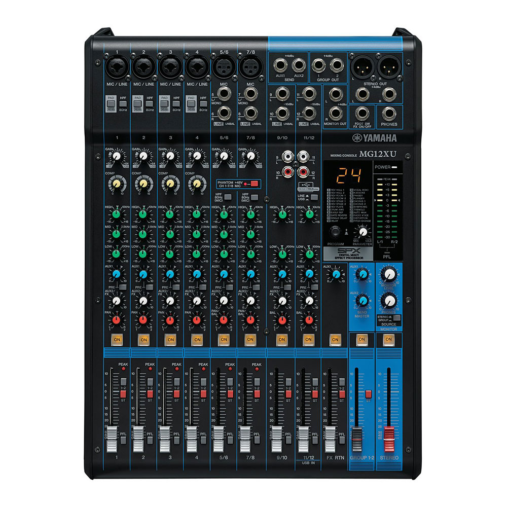 Yamaha MG12XU – 12-канальный аналоговый микшерный пульт с 6 микрофонными предусилителями, 4 стерео линейными каналами, 2 AUX-посылами, эквалайзерами, компрессорами и цифровыми эффектами. Компактный пульт отлично подойдет для выступлений, семинаров, домашней записи и других схожих задач. Он оснащен комбинированными линейными/микрофонными входами с предусилителями D-PRE, а также линейными входами на ? дюйма. В нем также предусмотрена возможность подключения по USB (2 входных и 2 выходных канала) и записи в компьютер с частотой 24 бит / 192 кГц, что отлично подойдет для записи живых выступлений и демо.