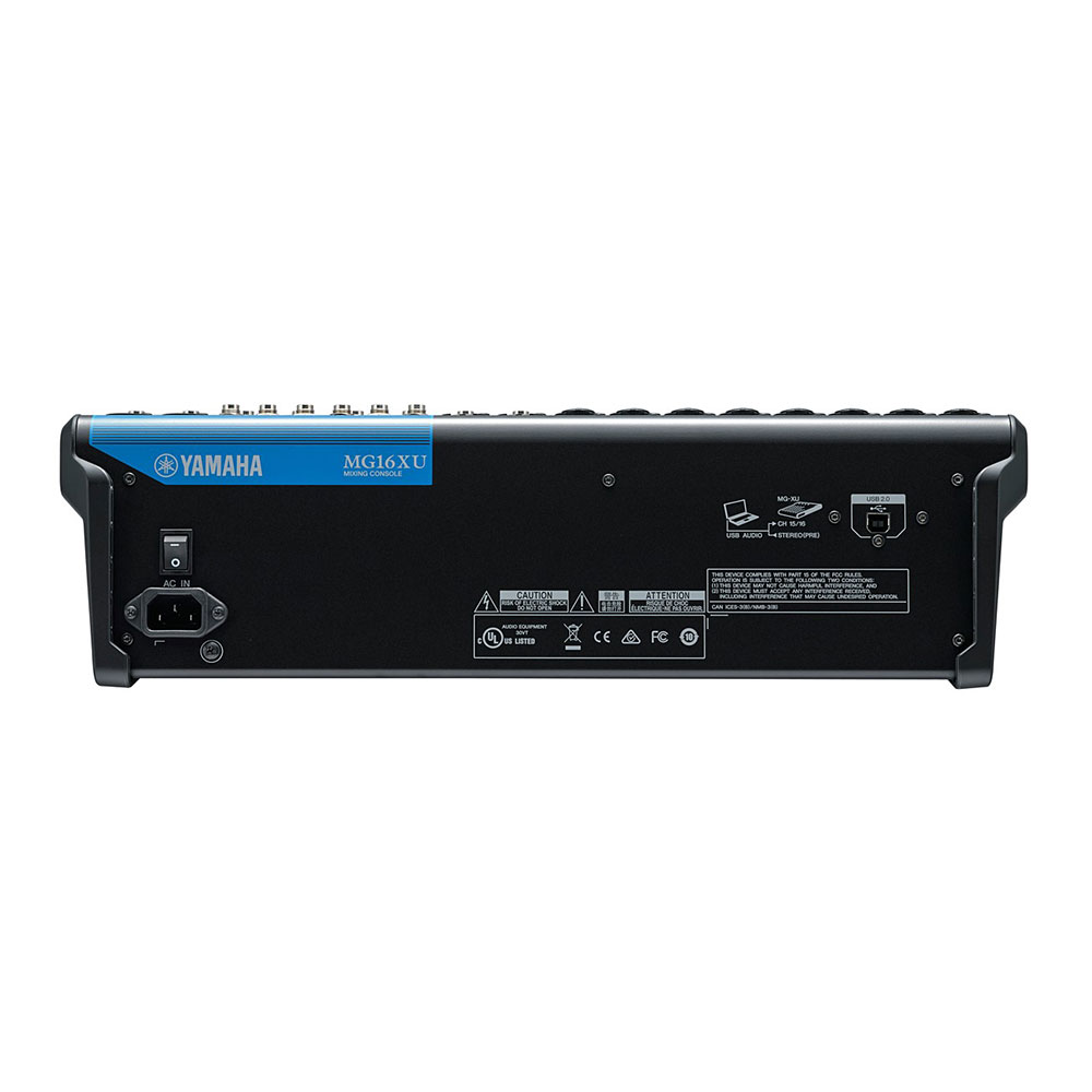 Две главных особенности Yamaha MG16XU – встроенные процессор эффектов (аналогичный тому, что применяется в процессорах эффектов SPX) и USB-аудиоинтерфейс. Последний предлагает 2 входа и 2 выхода со студийным качеством обработки звука 24 бит/192 кГц. Что же касается процессора эффектов, то всего доступно 24 пресета, которые переключаются кнопкой на панели эффектов, выбранная программа отображается на цифровом ЖК-дисплее, а степень воздействия эффекта на аудиотракт можно регулировать ручкой PARAMETER. Эффекты включают в себя различные варианты реверберации, хоруса, дилэя, фэйзера, флэнжера и т.д. с разнообразными их видами.
